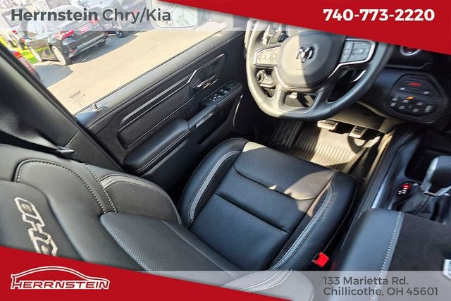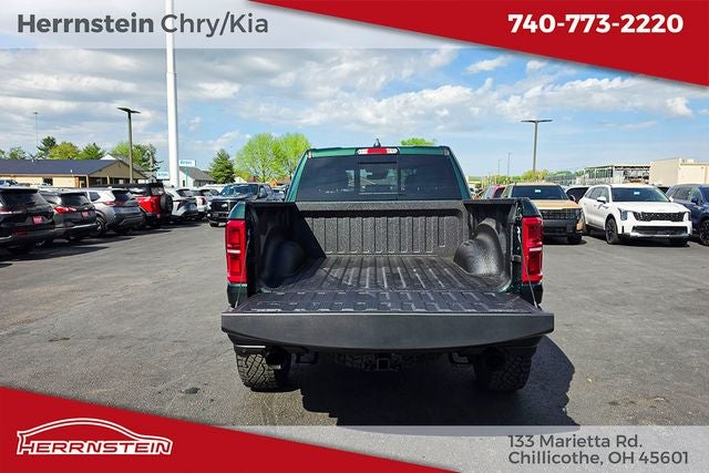 Herrnstein Auto Group is excited to offer this 2026 Ram 1500 RHO in Serrano Green Metallic with Black Leather. This 1500 is very well equipped with Quick Order Package 22Y RHO, 10 Speakers, 3.92 Rear Axle Ratio, 4-Wheel Disc Brakes, 4G LTE Wi-Fi Hot Spot, ABS brakes, Adaptive suspension, Adjustable pedals, Air Conditioning, Alloy wheels, AM/FM radio, Apple CarPlay/Android Auto, Auto High-beam Headlights, Auto Power-Folding Mirrors, Auto-dimming door mirrors, Auto-Dimming Exterior Driver Mirror, Auto-dimming Rear-View mirror, Automatic temperature control, Brake assist, Compass, Connected Travel and Traffic Services, Connectivity - US/Canada, Delay-off headlights, Disassociated Touchscreen Display, Driver door bin, Driver vanity mirror, Dual front impact airbags, Dual front side impact airbags, Electronic Stability Control, Exterior Mirrors Courtesy Lamps, Exterior Mirrors with Heating Element, Exterior Mirrors with Supplemental Signals, Exterior Parking Camera Rear, Flareside Box, Front anti-roll bar, Front Bucket Seats, Front Center Armrest w/Storage, Front dual zone A/C, Front fog lights, Front License Plate Bracket, Front reading lights, Front wheel independent suspension, Fully automatic headlights, Garage door transmitter, GPS Navigation, HD Radio, Heated door mirrors, Heated front seats, Heated steering wheel, Illuminated entry, Integrated Center Stack Radio, Integrated Voice Command with Bluetooth®, Leather Shift Knob, Leather steering wheel, Leather Trimmed Bucket Seats, Low tire pressure warning, Manufacturer's Statement of Origin, MOPAR RHO Exterior Graphics, Navigation System, Occupant sensing airbag, Outside temperature display, Overhead airbag, Overhead console, Panic alarm, Passenger door bin, Passenger vanity mirror, Power door mirrors, Power driver seat, Power passenger seat, Power steering, Power windows, Radio data system, Radio: Uconnect 5 Navigation with 12.0 Display, Rear reading lights, Rear seat center armrest, Rear step bumper, Rear window defroster, Remote keyless entry, Security system, SiriusXM Radio Service, Speed control, Split folding rear seat, Sport steering wheel, Steering wheel mounted audio controls, Tachometer, Telescoping steering wheel, Tilt steering wheel, Traction control, Trip computer, Turn signal indicator mirrors, USB Host Flip, Variably intermittent wipers, Voltmeter, and Wheels: 18 x 9 Black Paint/Polish Aluminum. 14/16 City/Highway MPG